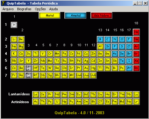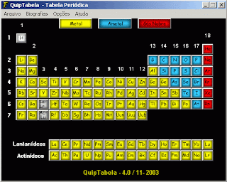 QuipTabela é uma Tabela Periódica interativa, que conta com 30 informações sobre cada um dos elementos químicos. O QuipTabela não é somente um banco de dados com informações químicas, mas sim, um software educacional que tem por objetivo: auxiliar na construção do conhecimento referente ao assunto Tabela Periódica e Periodicidade Química.